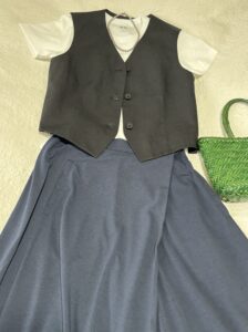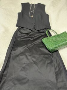 ベストに、コグザビッグスモークのサテンっぽい光沢のあるスカートを合わせて。